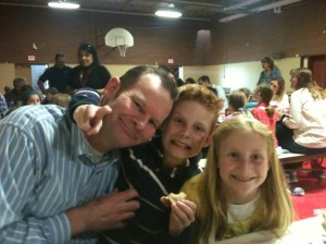 Okay. There was no food fight, but I thought about it. Donna would never have forgiven me, and I would have been sent to the principal’s office. We still had a good time in the cafa-gyma-torium, which is a pseudonym for giant room that serves as a cafeteria, gym, and auditorium. It was great to just hang out with my kids. Even Donna took time out of teaching up stairs to swing by. Good times. Good times.