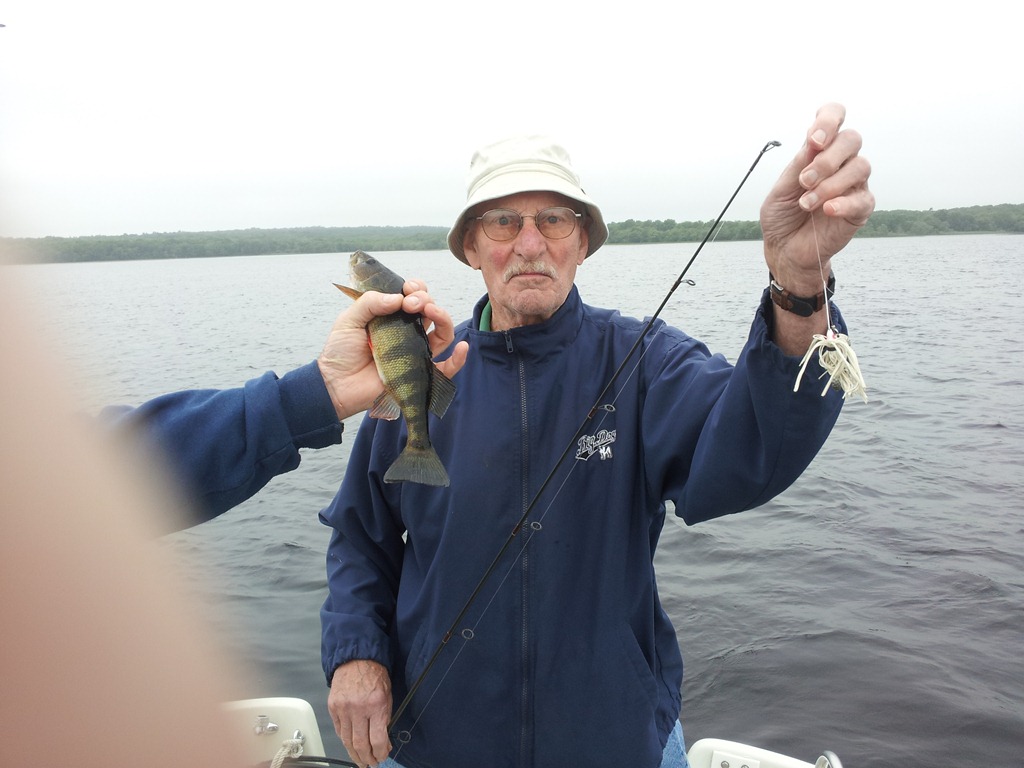 Martin and I took dad out fishing yesterday on Worden’s Pond. Eric joined us, despite the 5:30AM wake-up call. Dad caught the first fish of the day after insisting that we consider changing to a different color lure. Apparently he was right. He caught this Perch using a white lure, rather than the chartreuse Martin and I were using. Father knows best. As for Eric, he just wanted to go home, or eat pancakes, or pee, or something that did not involve being on the water on an uncharacteristically chilly June morning.