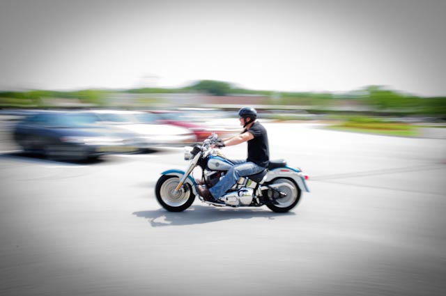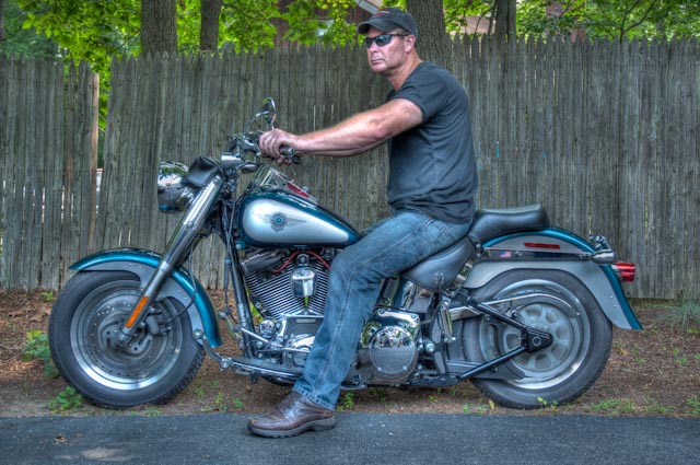 I took some shots of Martin and his “Hog” this morning, I have to say that the HDR shot (middle) might just be my favorite HDR photo yet. I kept it subtle this time, without all the “bling.” You can see a larger version of the photo on Flickr. The top shot is of me taking the shot (see reflection – ignore motor). The bottom shot was taken at a nearby Stop & Shop parking lot – just down the street. Martin made a few drive-bys, but the bright sun was too much for an optimal shot using the slow shutter speed. I was able to sort of salvage this one from the dozen I shot. Oh, well – live and learn. Did I mention this Hog is loud.